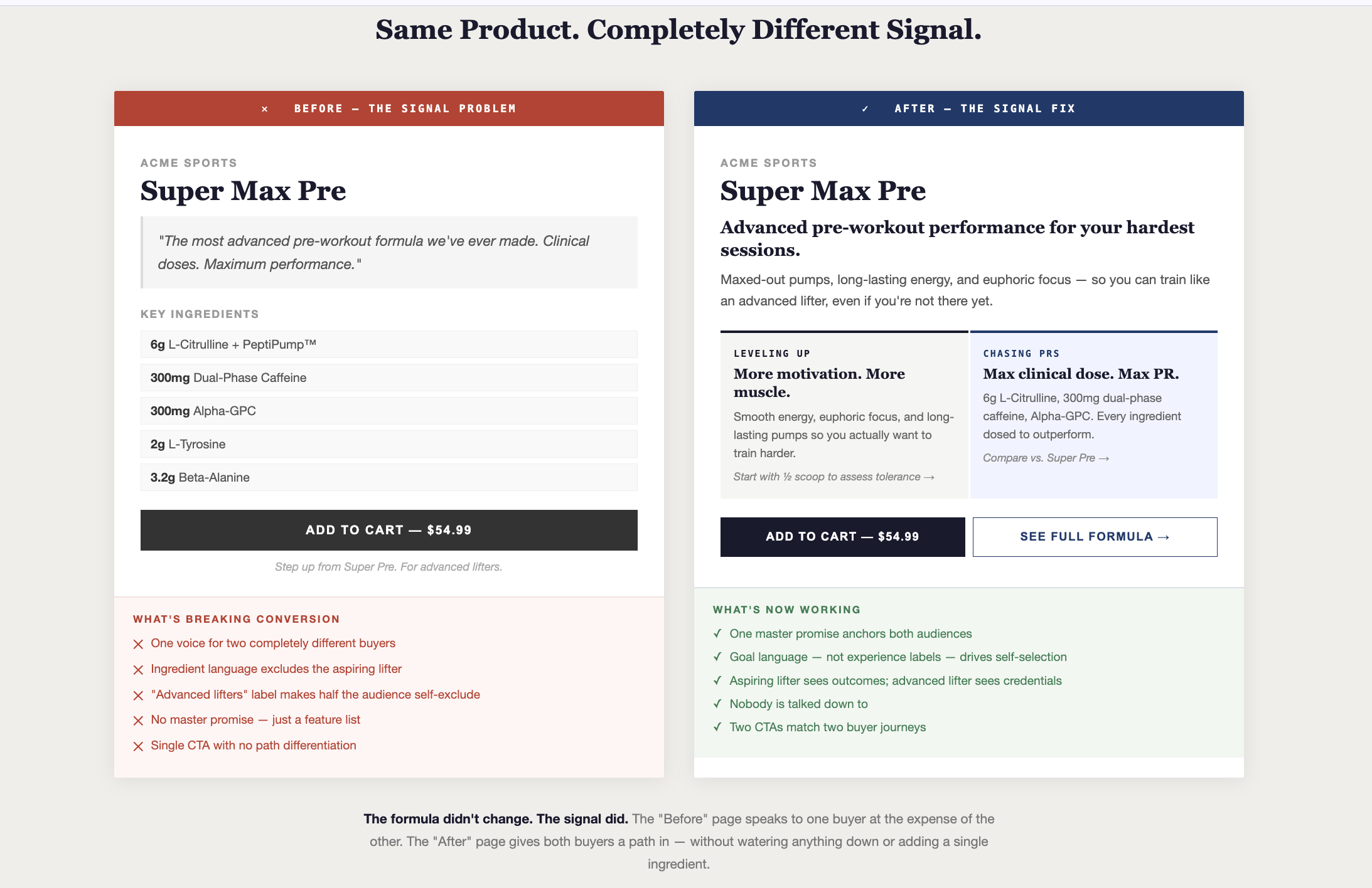 The experienced lifter reads the clinical callouts and buys on credentials. The aspiring lifter reads the benefit language and buys on outcome. Neither feels like they’re being talked down to. Neither is confused about whether this product is for them.